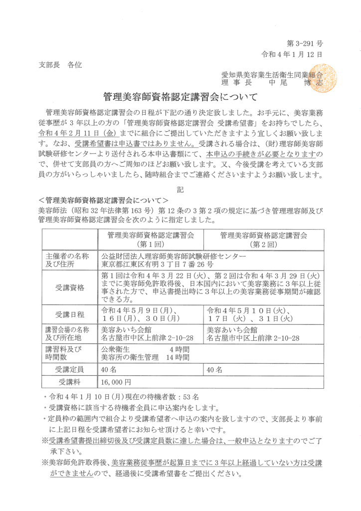 令和4年管理美容師資格認定講習会のお知らせ | 美容あいち 安城支部 | 安城市の美容院/美容室/ヘアサロン約100店舗が加盟する美容組合です。