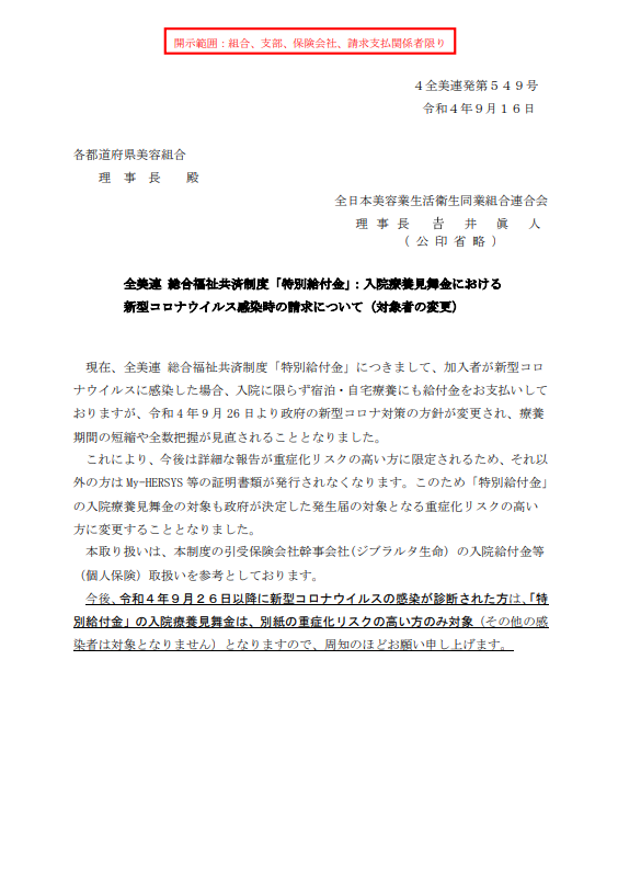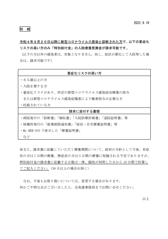 全美連 総合福祉共済制度「特別給付金」:入院療養見舞金における新型コロナウイルス感染時の請求について(対象者の変更)