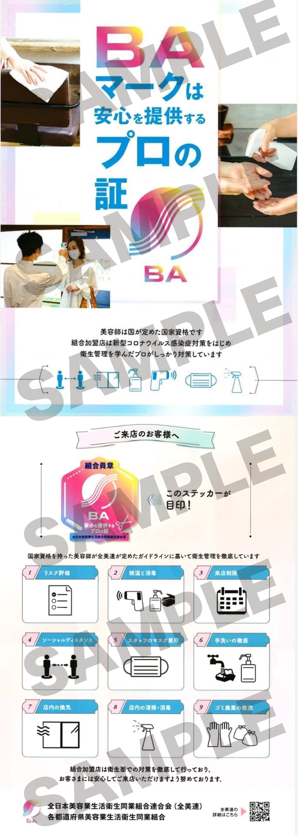 平素より感染症対策にご尽力いただき、改めて感謝申し上げます。美容組合では、その活動を支援するため「BAマークステッカー」と「PRちらし」を配布することとなりました。安心安全な店舗としてのPRにご活用いただければ幸いです。今後とも感染症対策にご尽力いただきますよう、何卒宜しくお願い致します。