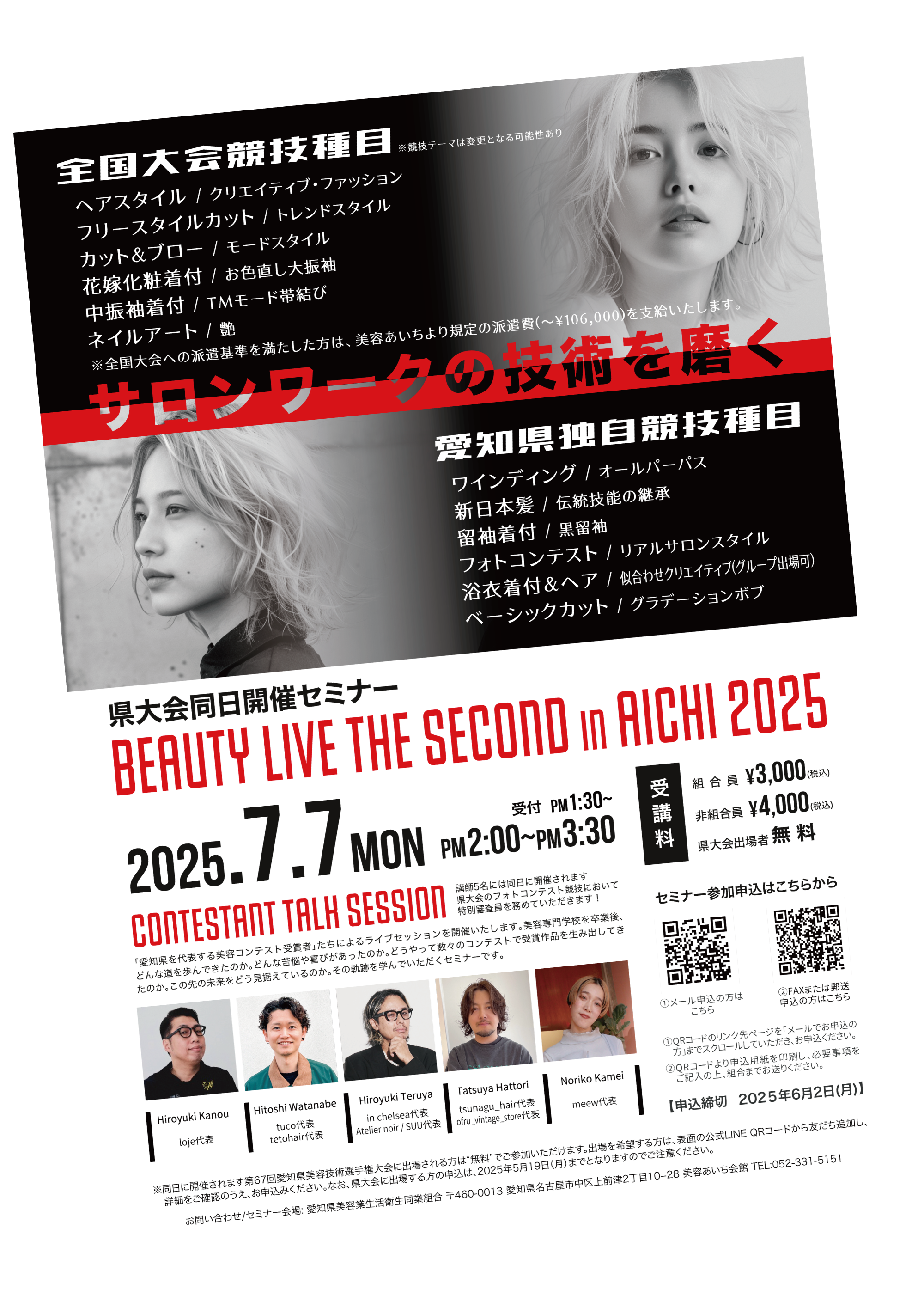 「第67回愛知県美容技術選手権大会」および「同時開催セミナー/BEAUTY LIVE THE SECOND」の参加募集を開始しました!!